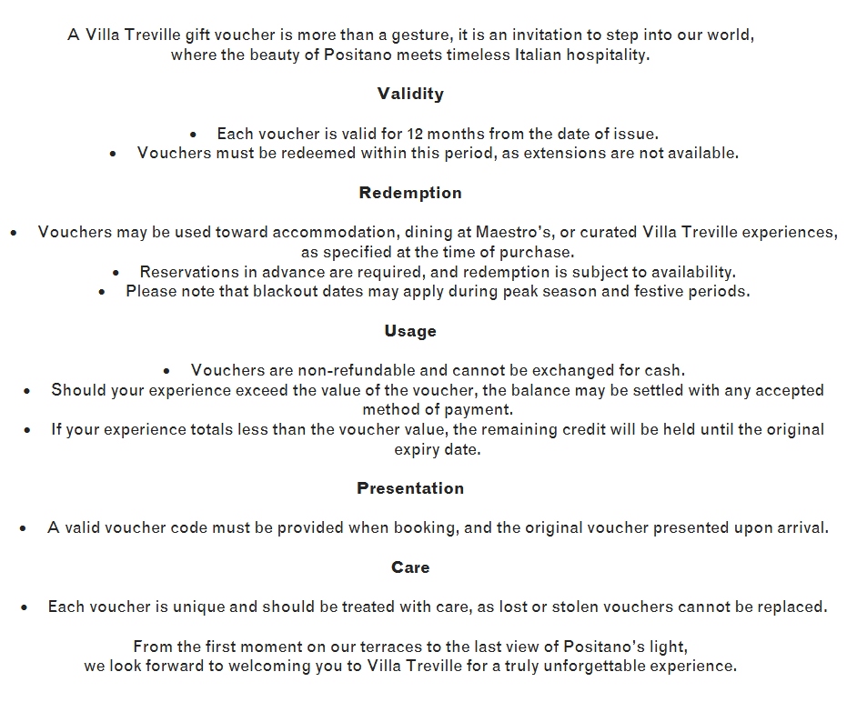 A Treville Positano Hotel gift voucher is more than a gesture, it is an invitation to step into our world, where the beauty of Positano meets timeless Italian hospitality.